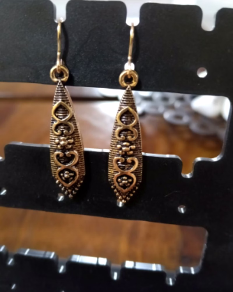 - Elongated oxidised silver drop earring design