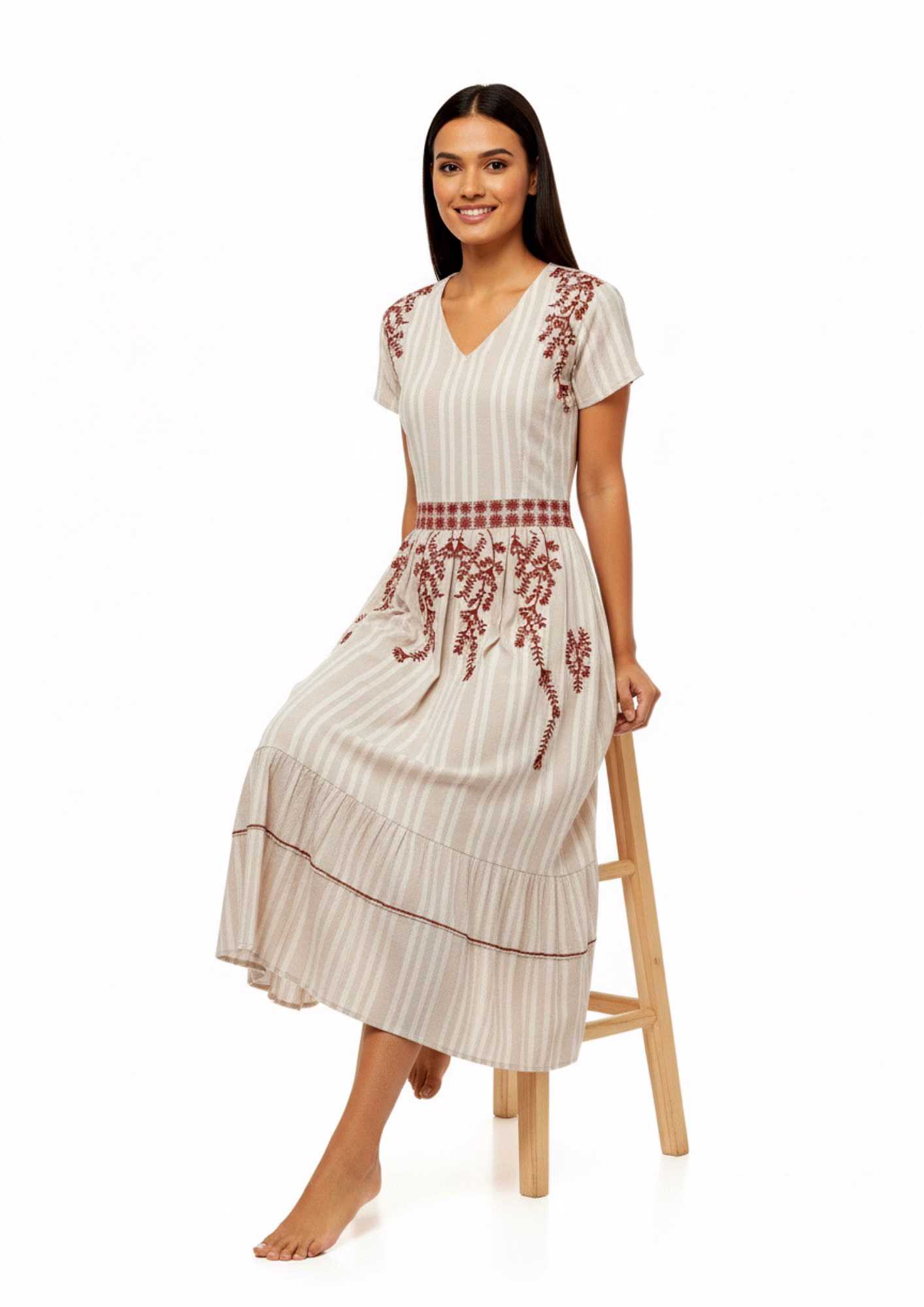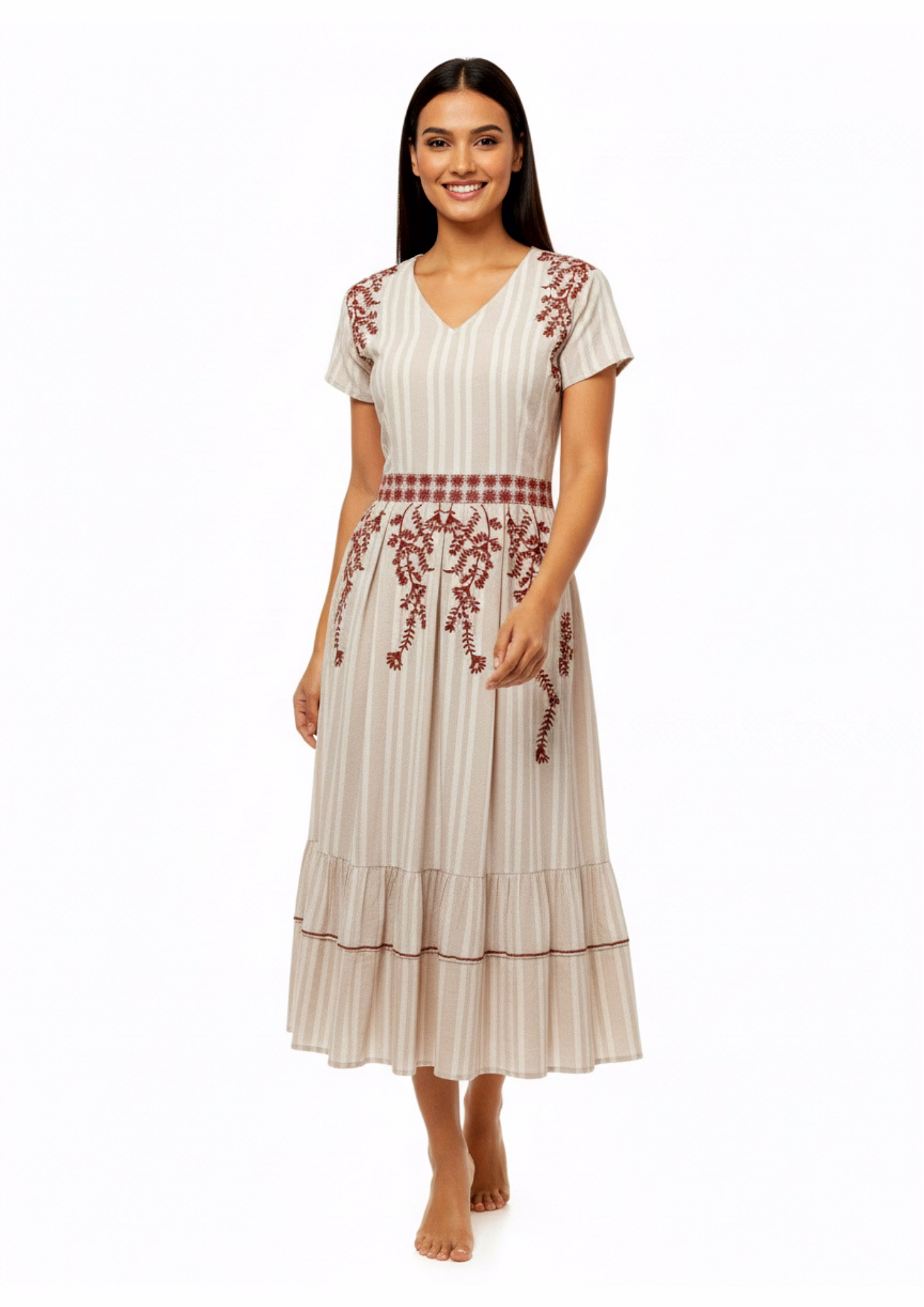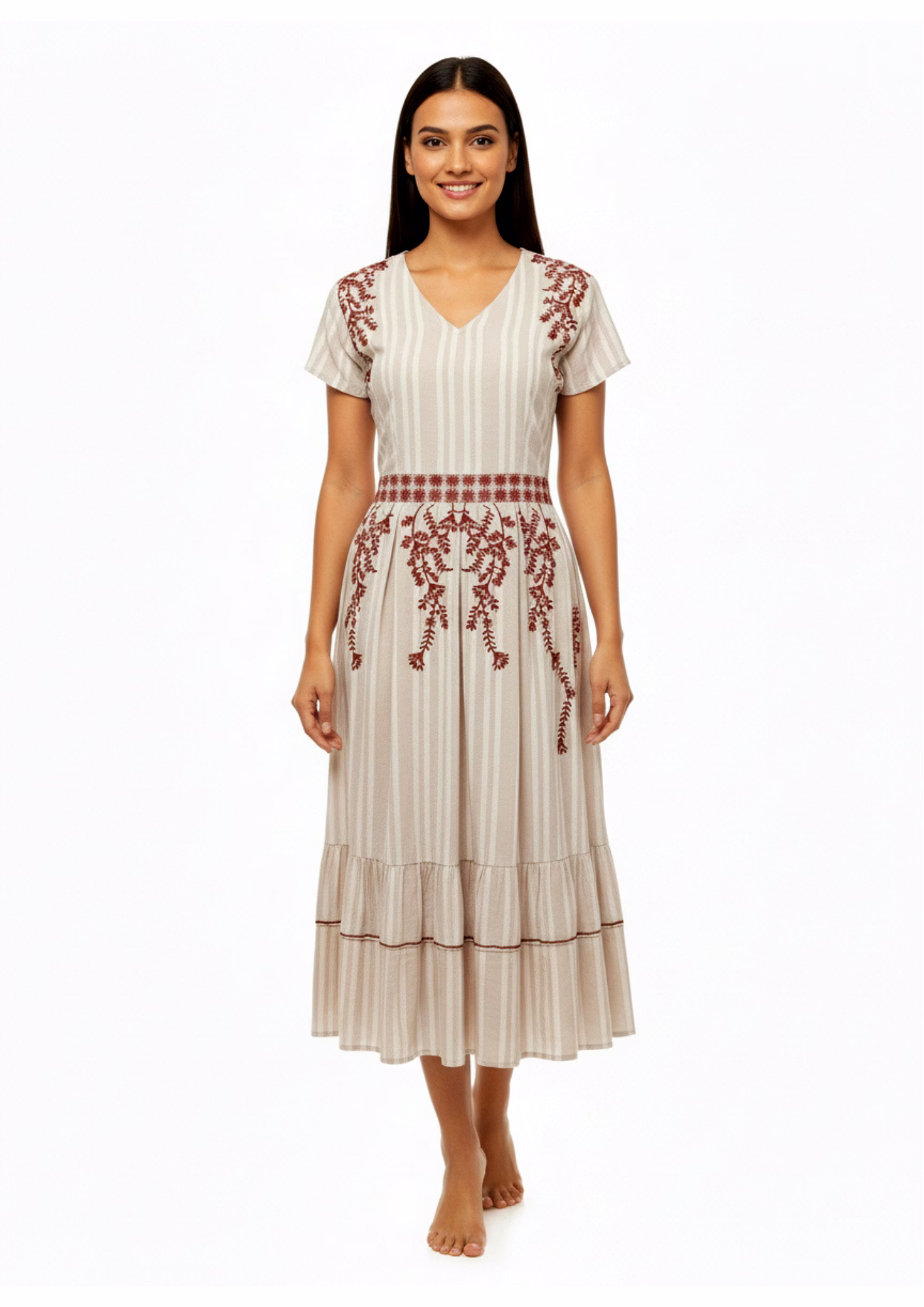 Crafted from 100% cotton fabric, the gown offers a balanced combination of breathability, drape, and durability suitable for regular wear. Embroidered detailing and floral motif patterns add depth and texture without adding weight or complexity to garment care. Seams, panel placements, and finishing techniques are designed to withstand routine laundering and handling in typical household conditions.