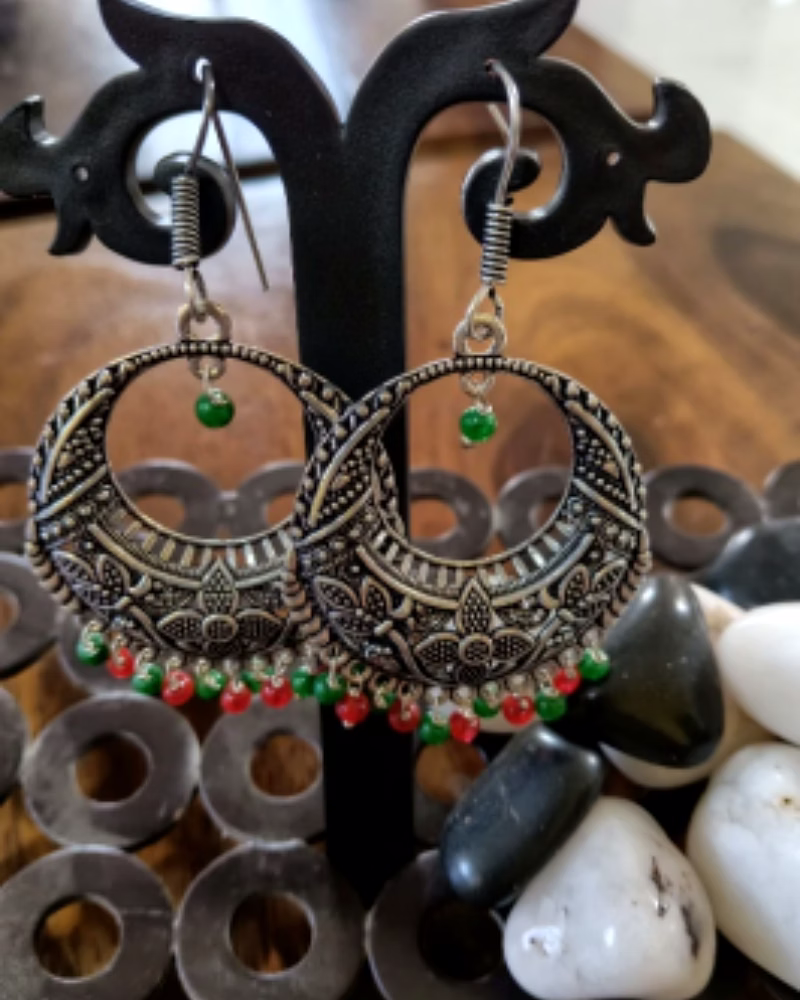 Heritage Oxidised Silver Green & Red Bead Circular Earrings