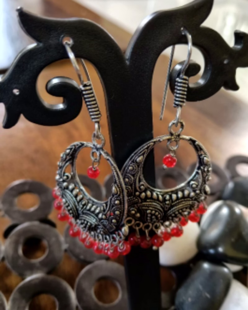Rich red bead detailing introduces a bold contrast against the silver tone, adding vibrancy and cultural warmth.
