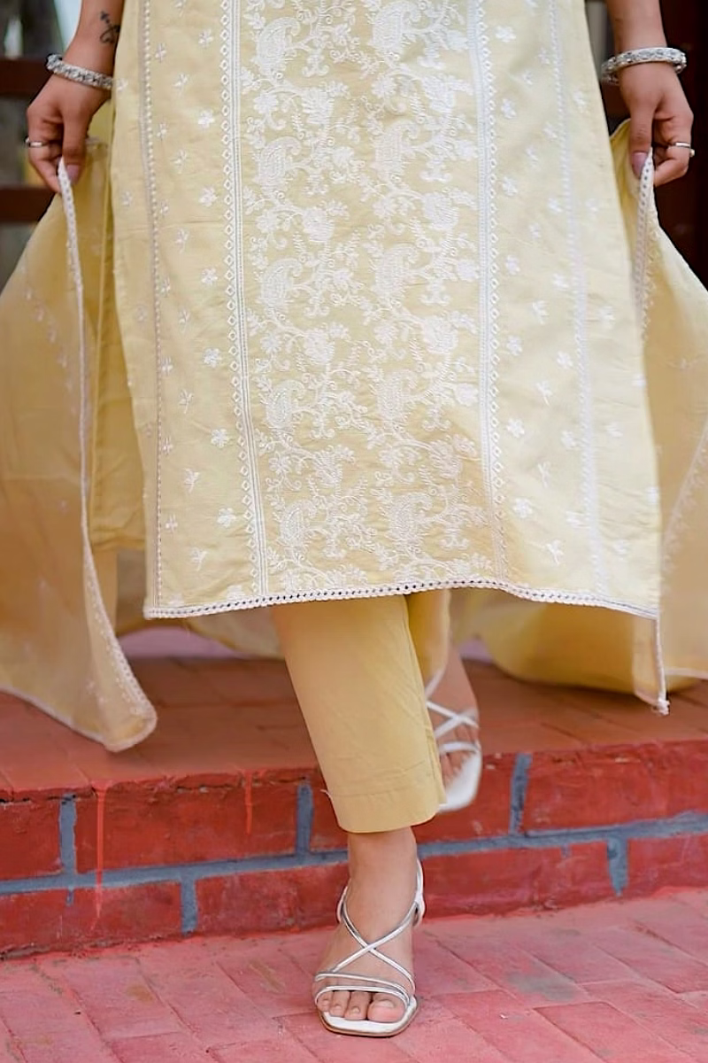 Lemon Yellow Unstitched Cotton Suit with White Thread Embroidery