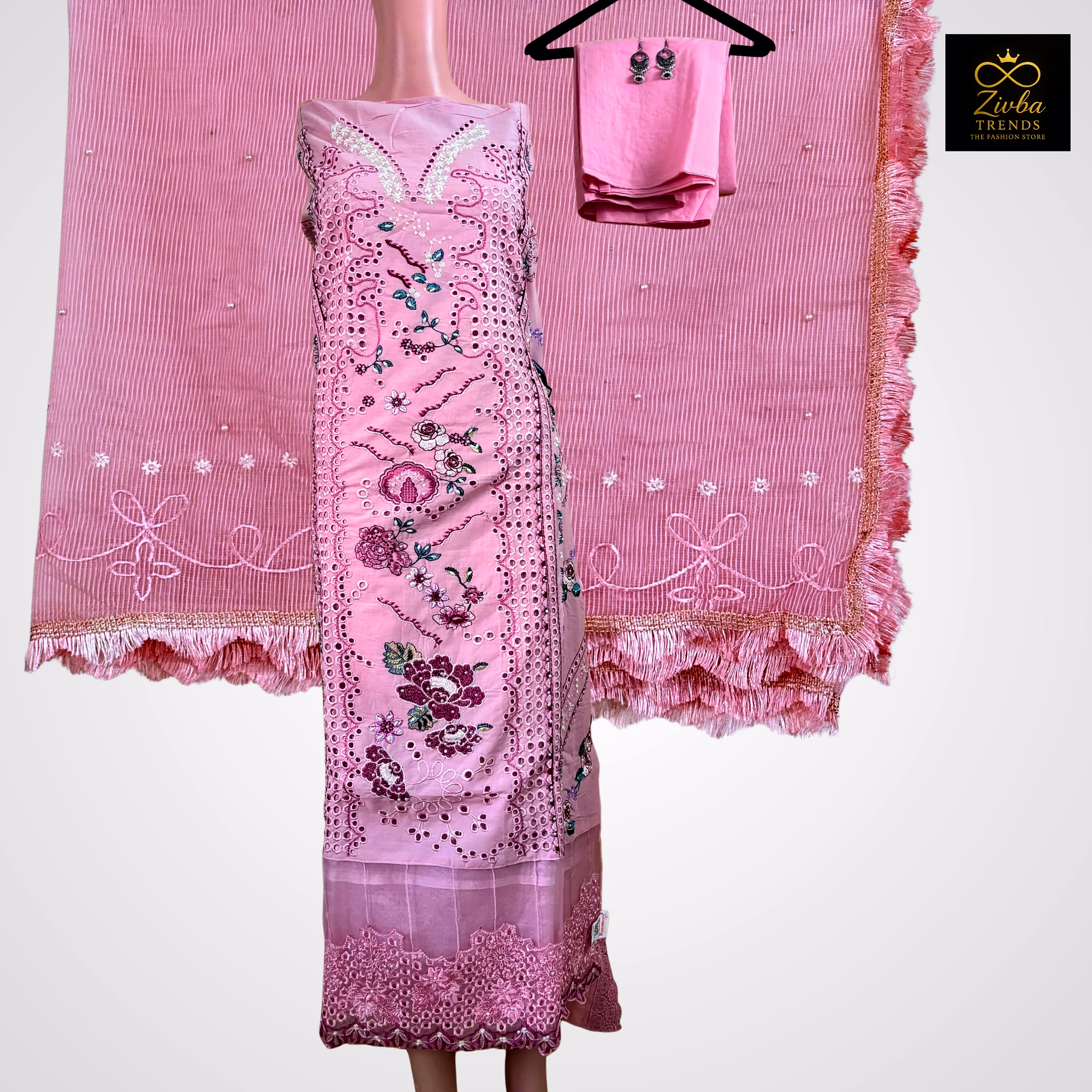 This Light Pink unstitched suit from Zivba Trends is designed for buyers seeking reliable women's unstitched suit suitable for both Indian and international markets. The fabric and construction are selected to offer everyday comfort and dependable wear with a suit set format that works well for office, festive and occasion wear. Design elements such as embroidered detailing, cut-work design add visual interest while maintaining a balanced, wearable look for repeat use. Standardised sizing supports easy assortment planning for retailers, resellers and online marketplaces. This style is well suited for boutiques, e-commerce sellers and wholesale buyers looking for consistent women痴 ethnic wear options.