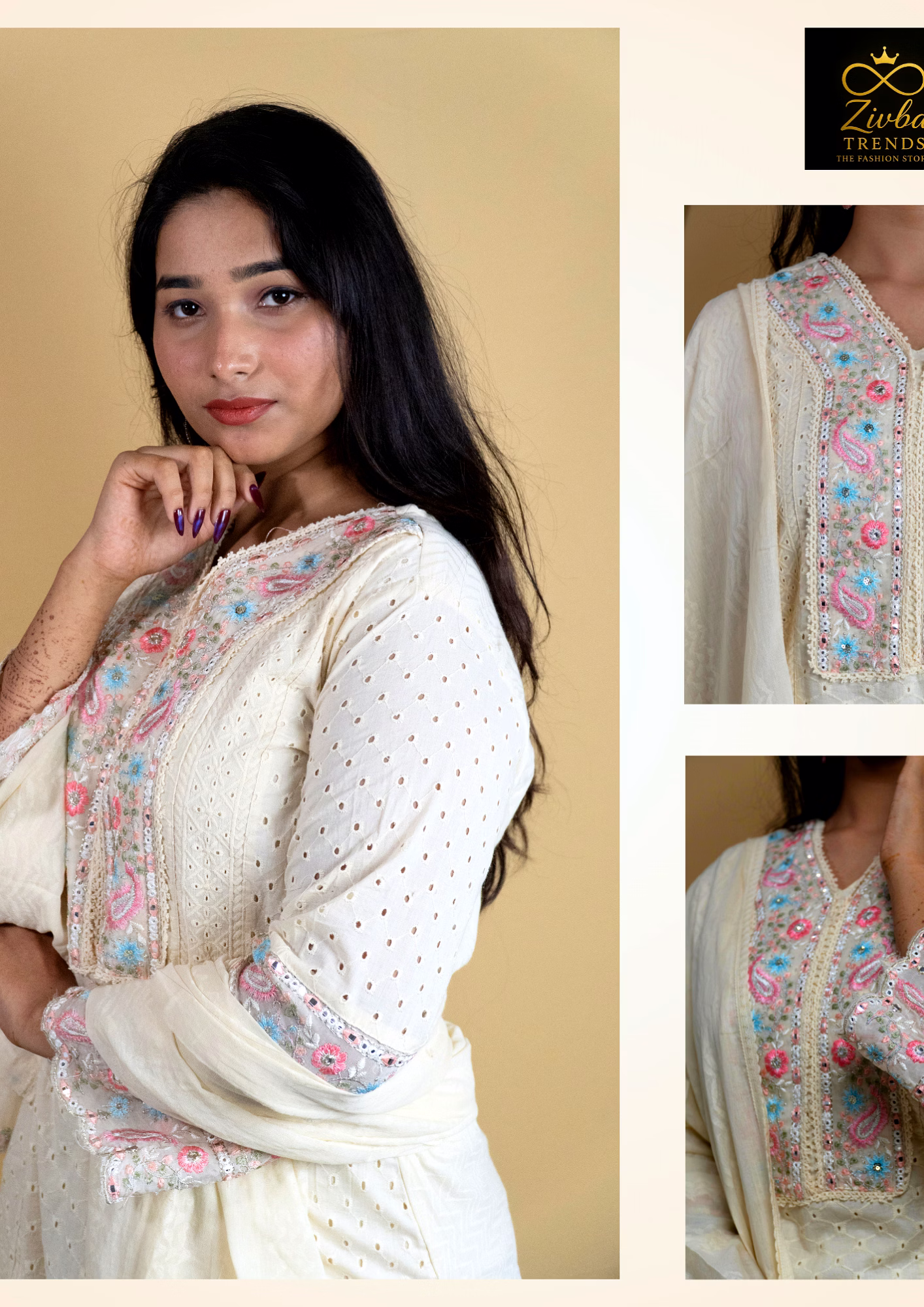 This Off White readymade suit set, in pure cotton fabric from Zivba Trends is designed for buyers seeking reliable women's ethnic suit set suitable for both Indian and international markets. The pure cotton fabric offers a balance of comfort and structure with a suit set format that works well for office, festive and occasion wear. Design elements such as embroidered detailing, cut-work design, chikankari-style embroidery add visual interest while maintaining a balanced, wearable look for repeat use. Standardised sizing supports easy assortment planning for retailers, resellers and online marketplaces. This style is well suited for boutiques, e-commerce sellers and wholesale buyers looking for consistent women痴 ethnic wear options.