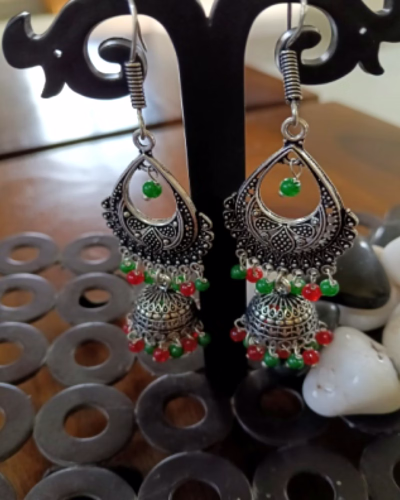 Oxidized Silver Filigree Jhumka Earrings | Green & Red Beads