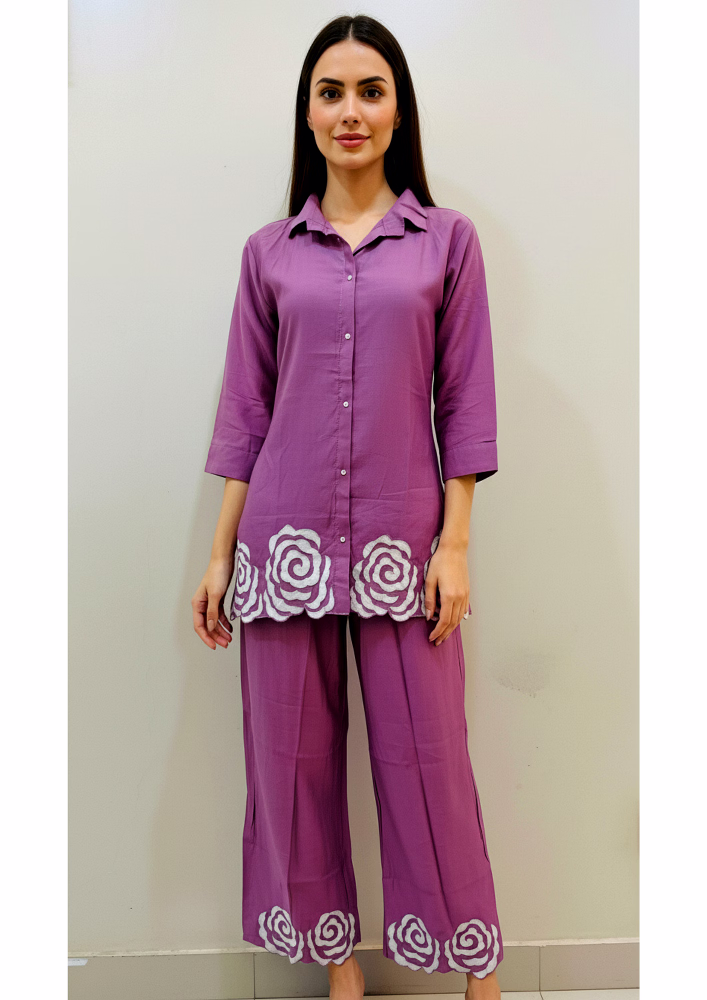 This Purple co-ord set, in Roman silk fabric from Zivba Trends is designed for buyers seeking reliable women's co-ord set suitable for both Indian and international markets. The Roman silk fabric offers a balance of comfort and structure with a coordinated top-and-bottom silhouette that is easy to style. Design elements such as cut-work design add visual interest while maintaining a balanced, wearable look for repeat use. Available sizes (L,XL,XXL) support easier assortment planning for retailers and aggregators working across varied body types. This style is well suited for boutiques, e-commerce sellers and wholesale buyers looking for consistent women痴 ethnic wear options.