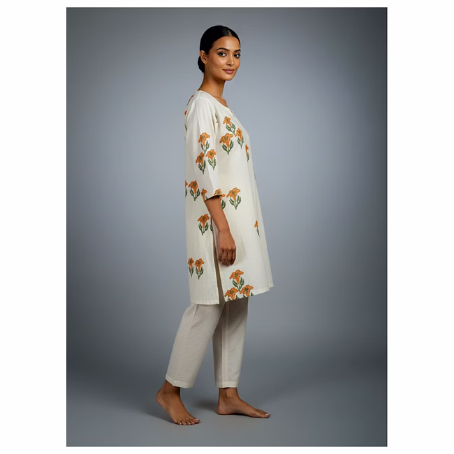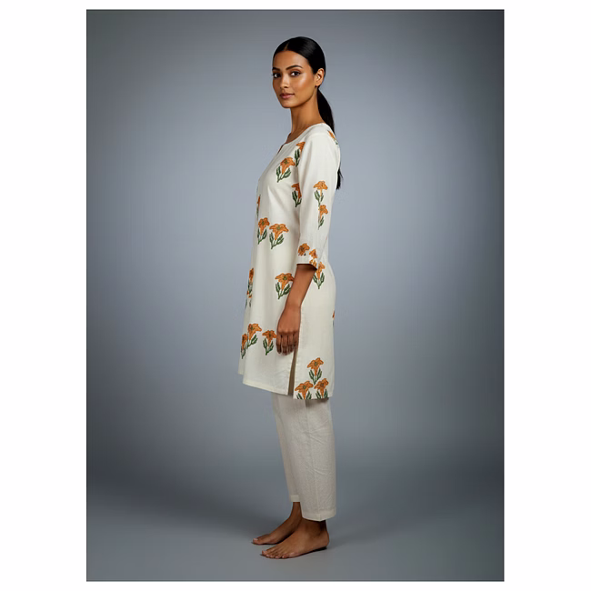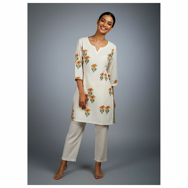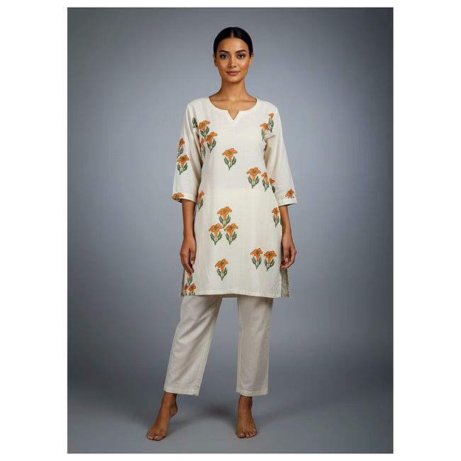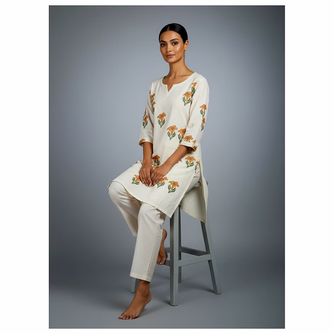 Crafted in Roman silk fabric, the garment offers a smooth drape, breathable comfort, and durability appropriate for routine wear. The cut-work detailing enhances texture and visual depth without adding significant weight or complexity to garment care. Stitching, seam placement, and construction methods are planned to withstand regular handling, laundering, and long-term wardrobe use.