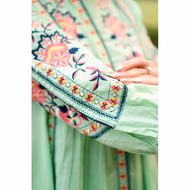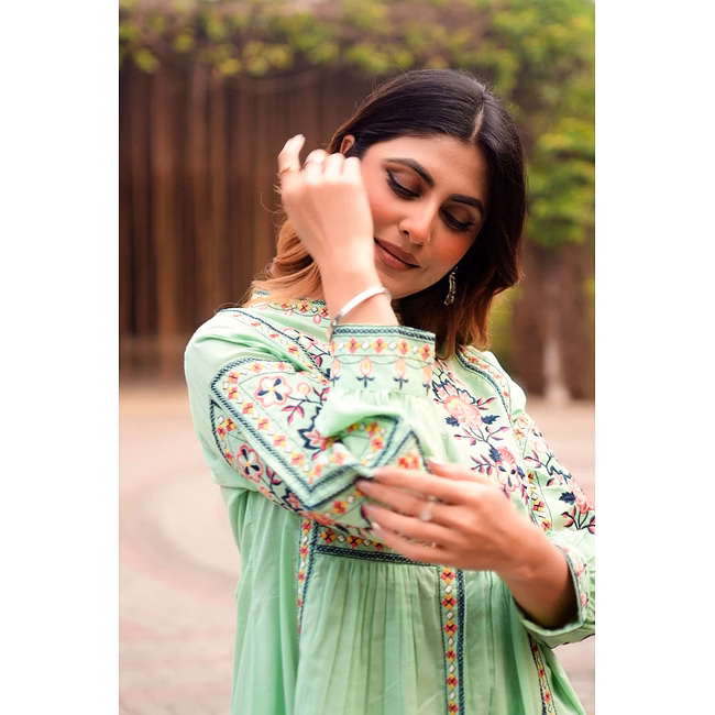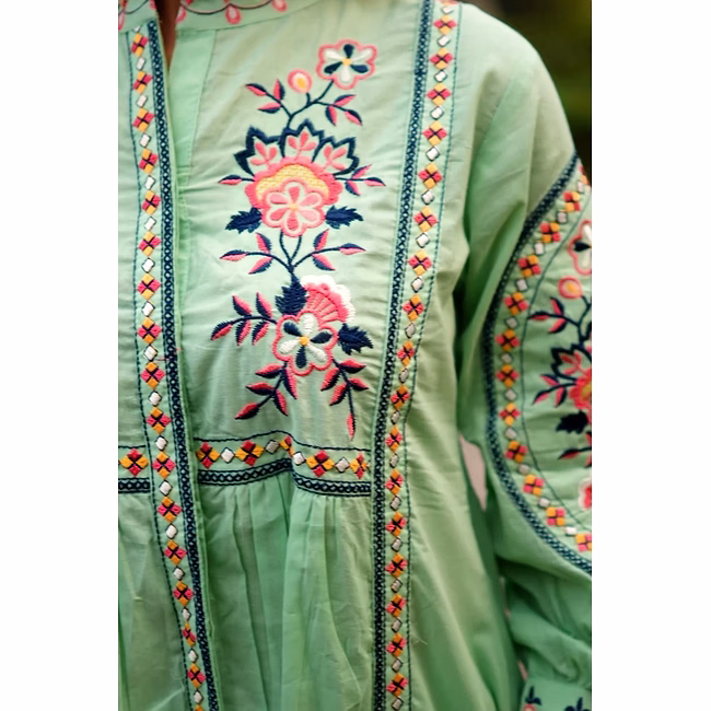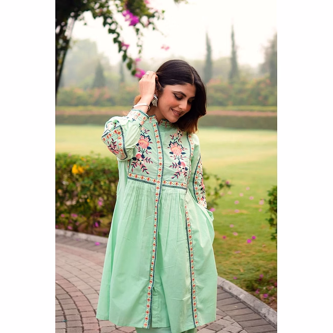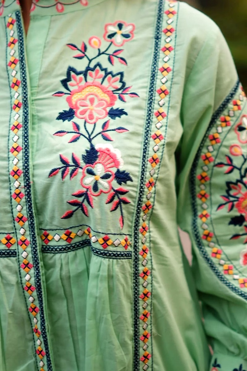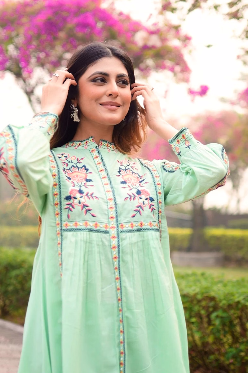 The garment uses cotton fabric, selected to provide a balance of breathability, drape and durability appropriate for regular wear. Surface styling with embroidered detailing, floral motif pattern adds visual depth without significantly increasing weight or complexity in care. Seams and panel placements are planned for regular usage scenarios, supporting repeat laundering and handling in typical household conditions.