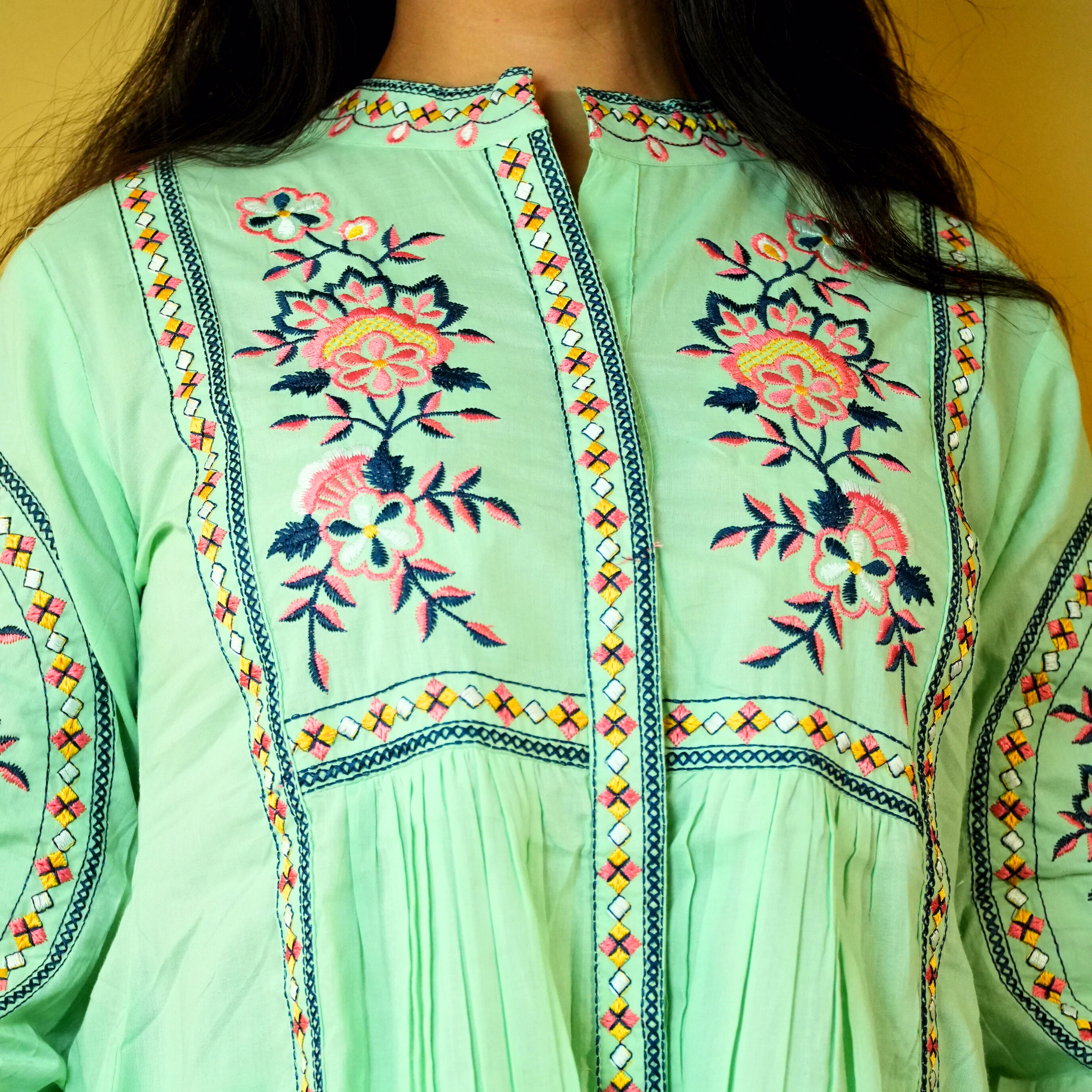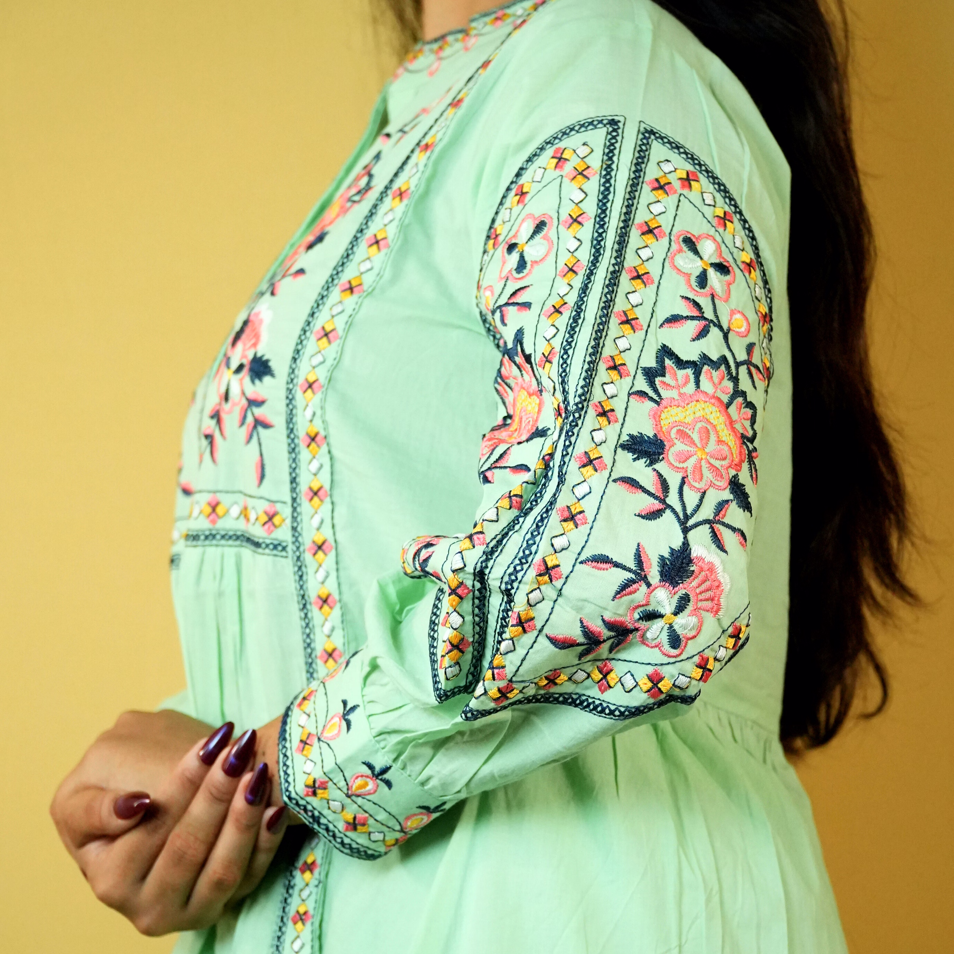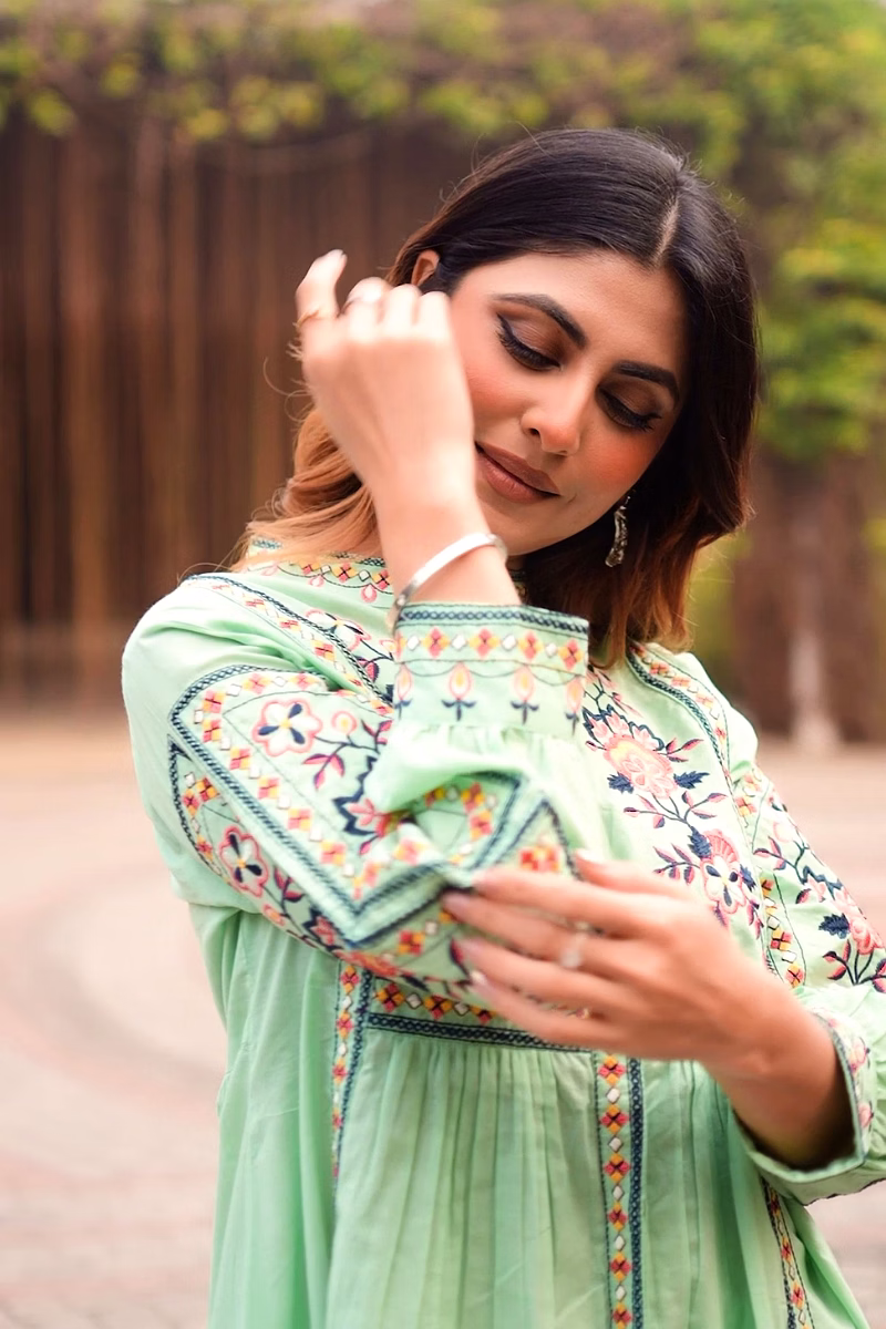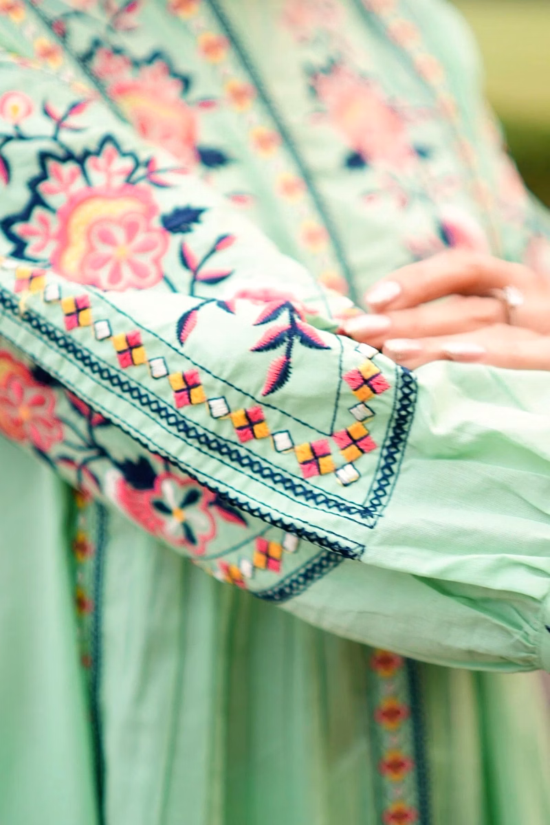 The garment uses cotton fabric, selected to provide a balance of breathability, drape and durability appropriate for regular wear. Surface styling with embroidered detailing, floral motif pattern adds visual depth without significantly increasing weight or complexity in care. Seams and panel placements are planned for regular usage scenarios, supporting repeat laundering and handling in typical household conditions.