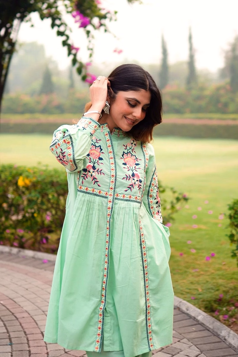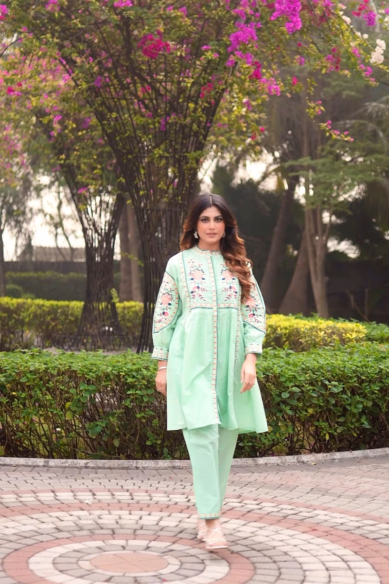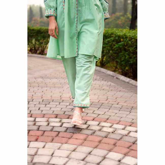 Sea Green Embroidered Cotton Co-Ord Set with Round Neck