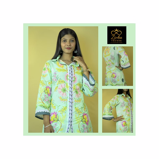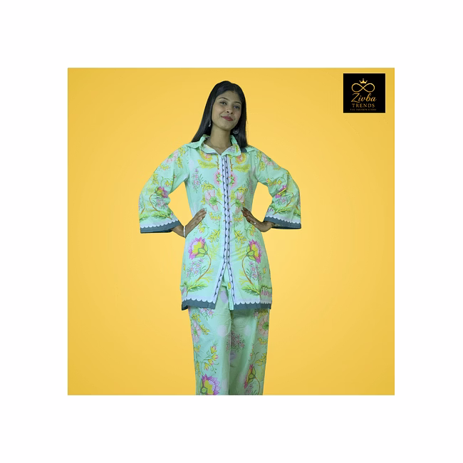 Sea green floral co-ord set from Zivba Trends is positioned as a practical yet attractive choice for buyers seeking dependable cotton co-ord set for women for Indian and export markets. The design balances day-to-day usability with an ethnic aesthetic, making it suitable for retail stores, resellers and online marketplaces. As a two-piece coordinated outfit, it simplifies styling for end users while allowing retailers to present a complete look on racks or mannequins.