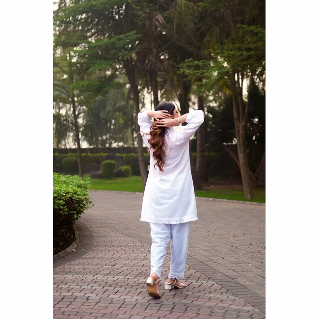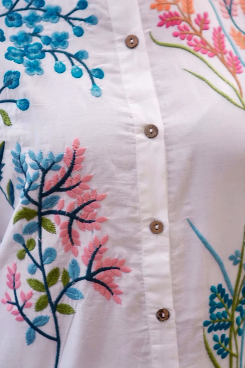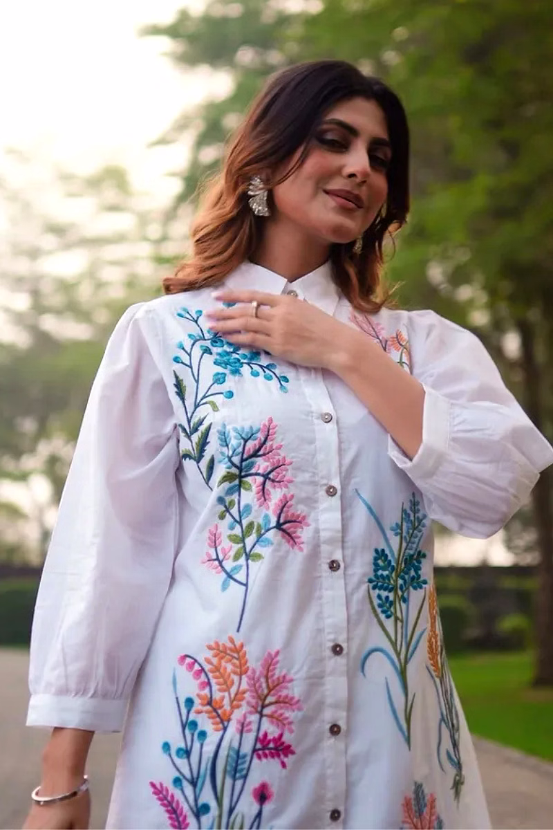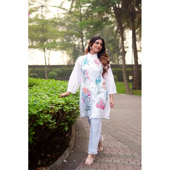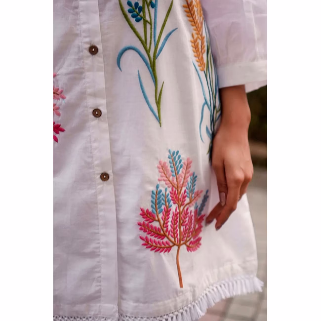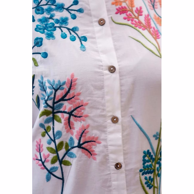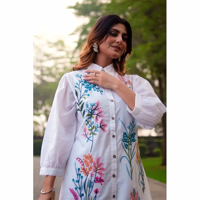 The garment uses pure cotton fabric, selected to provide a balance of breathability, drape and durability appropriate for regular wear. Surface styling with embroidered detailing, thread work accents adds visual depth without significantly increasing weight or complexity in care. Seams and panel placements are planned for regular usage scenarios, supporting repeat laundering and handling in typical household conditions.