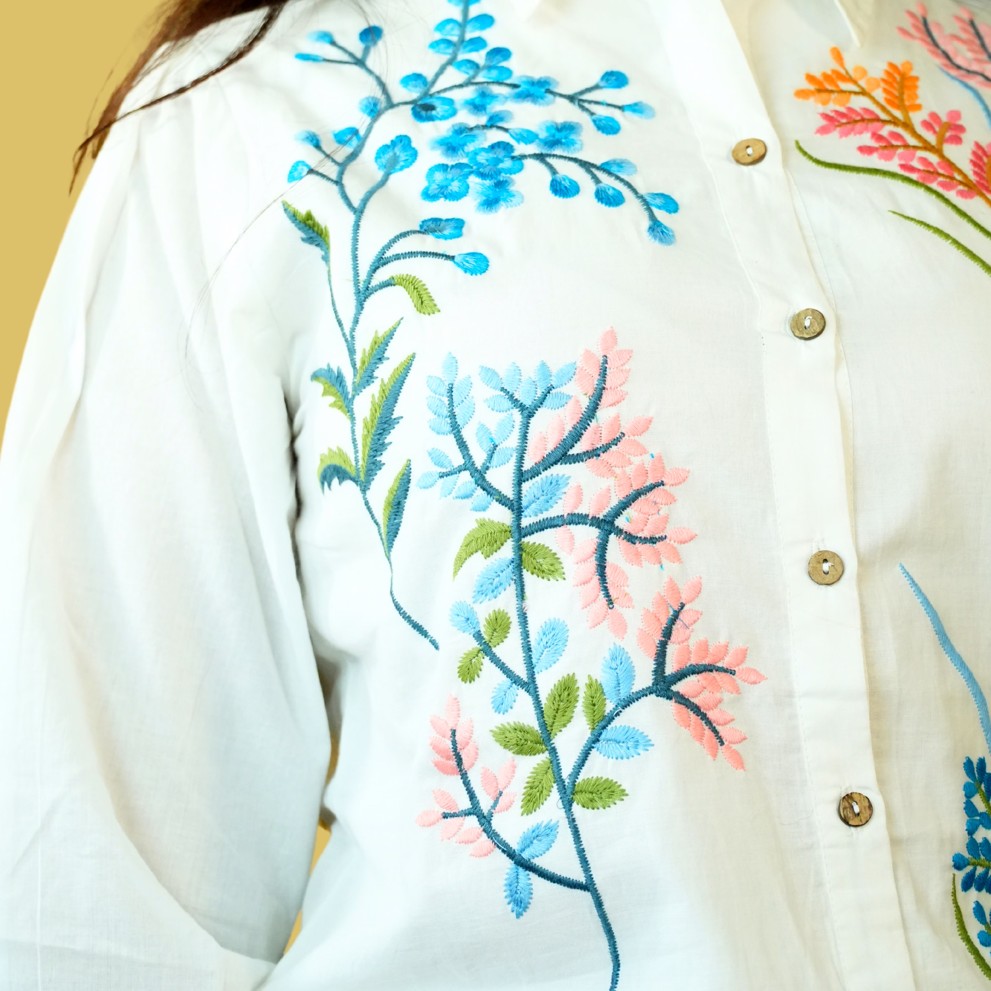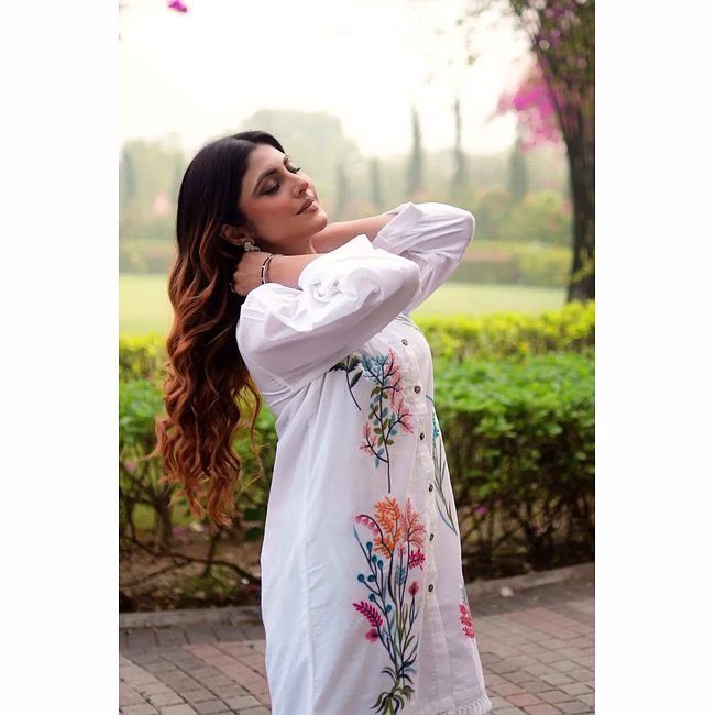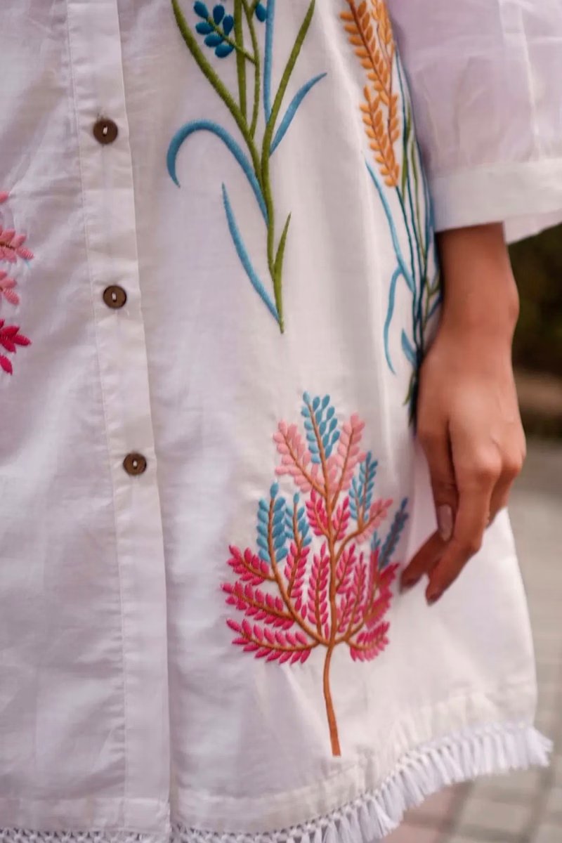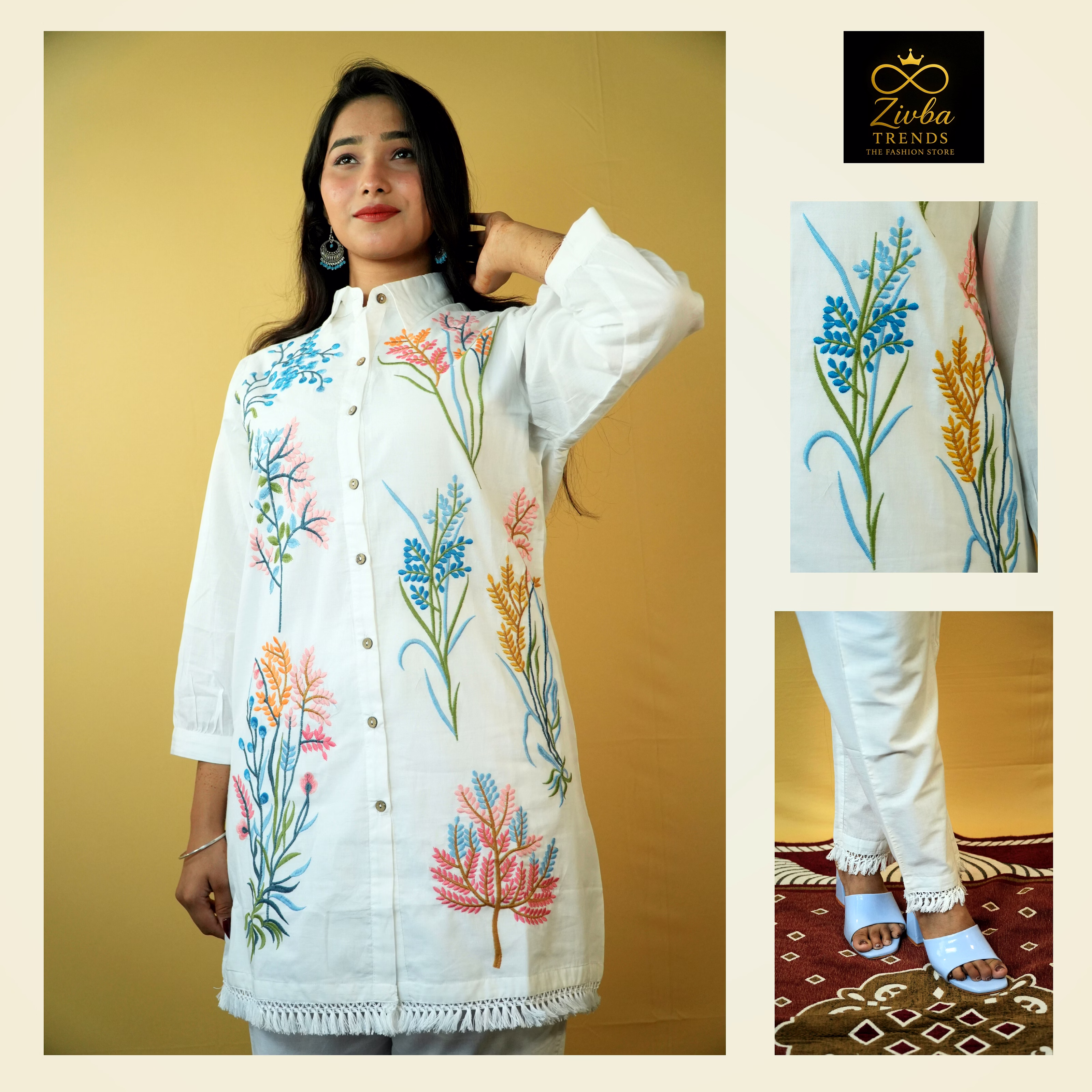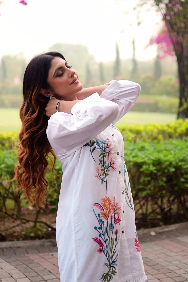 The garment uses pure cotton fabric, selected to provide a balance of breathability, drape and durability appropriate for regular wear. Surface styling with embroidered detailing, thread work accents adds visual depth without significantly increasing weight or complexity in care. Seams and panel placements are planned for regular usage scenarios, supporting repeat laundering and handling in typical household conditions.