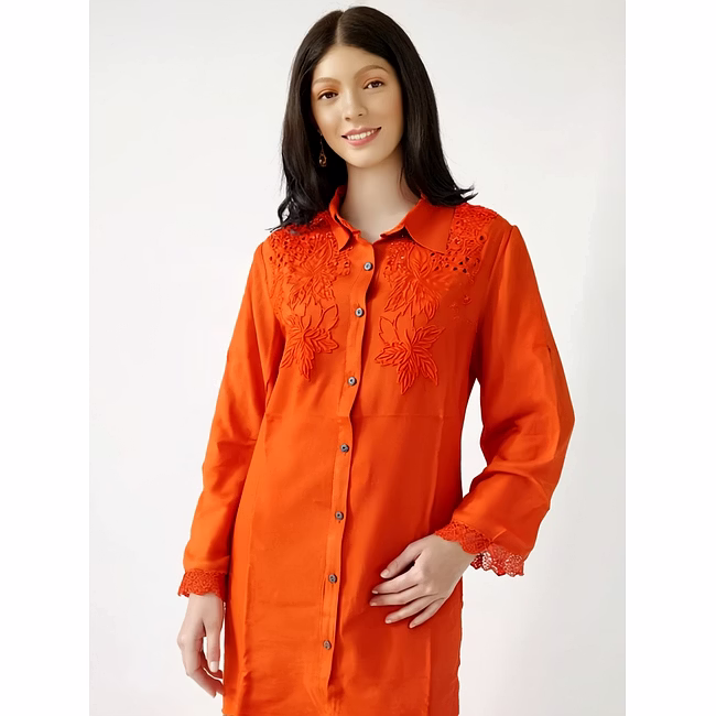 This orange rayon embroidered co-ord set blends elegance with comfort. Designed with a button-down long shirt and matching pants, it offers a breathable, lightweight feel—ideal for office, outings, or festive occasions.