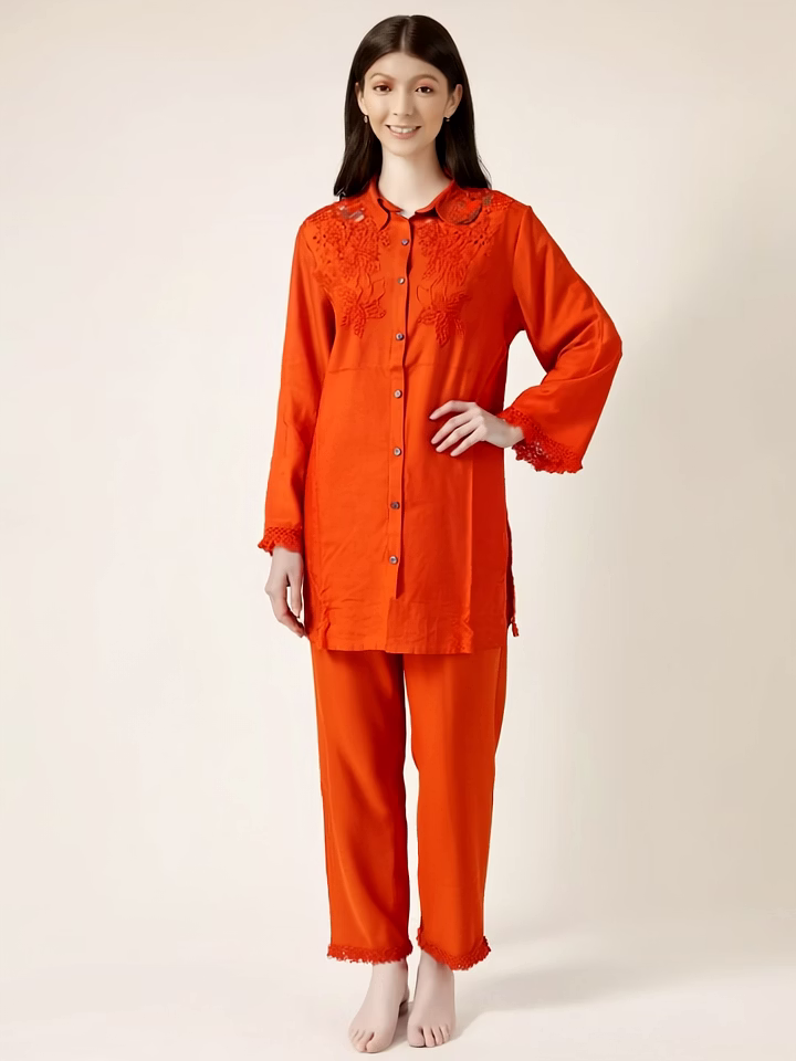 Elevate your style with this elegant Rust Colour Rayon Co-ord Set, designed for comfort and sophistication. Made from premium rayon fabric, this outfit offers a lightweight, breathable, and skin-friendly feel, perfect for all-day wear. The top features a button-down long shirt with floral embroidery on the yoke and lace-detailed cuffs, giving it a refined and feminine look. It is paired with matching straight-fit pants, creating a complete coordinated outfit suitable for festive gatherings, casual outings, and office wear. The rust shade adds a bold yet classy charm, making this set a versatile addition to your wardrobe. Available in multiple sizes with a tailored fit, this co-ord set ensures both style and comfort.