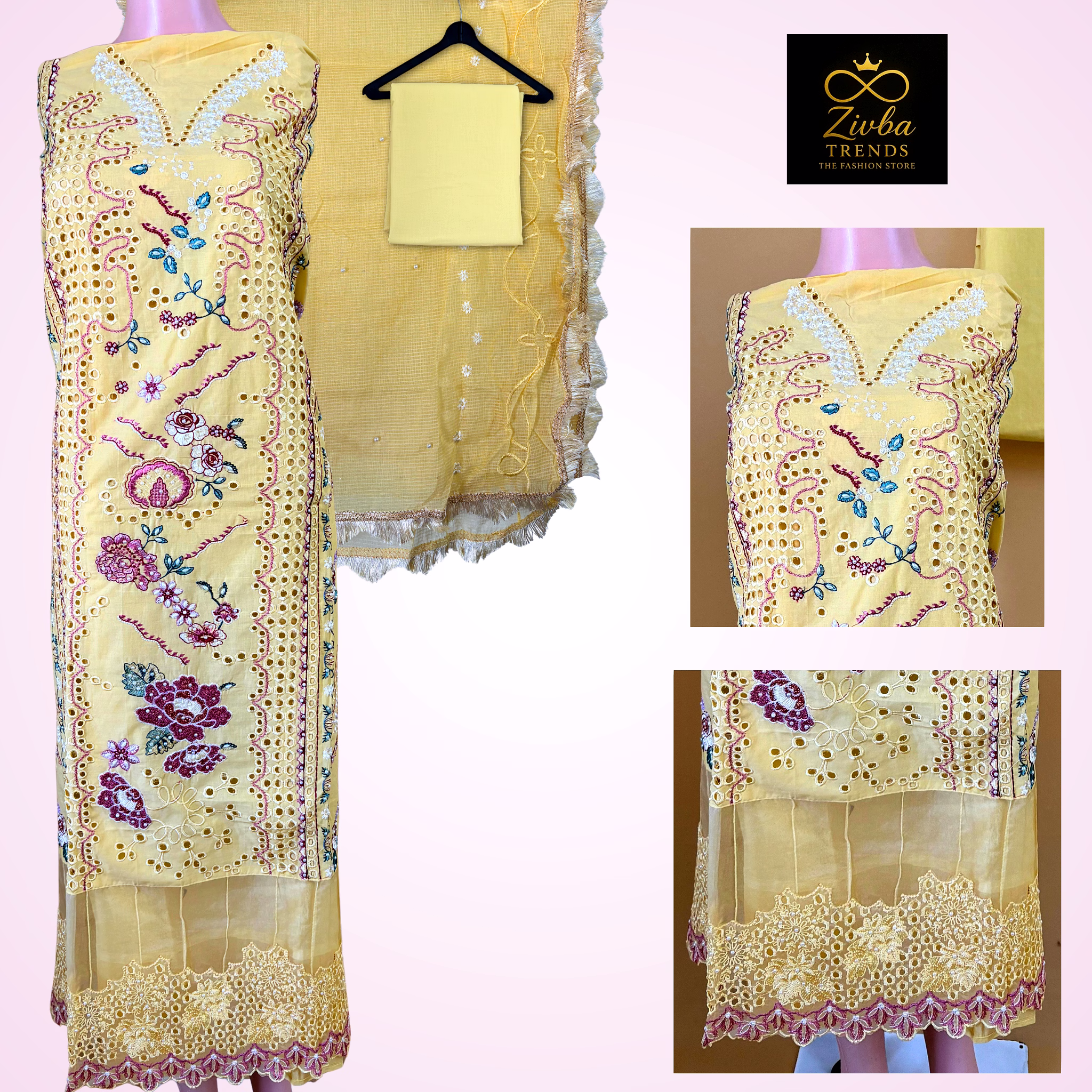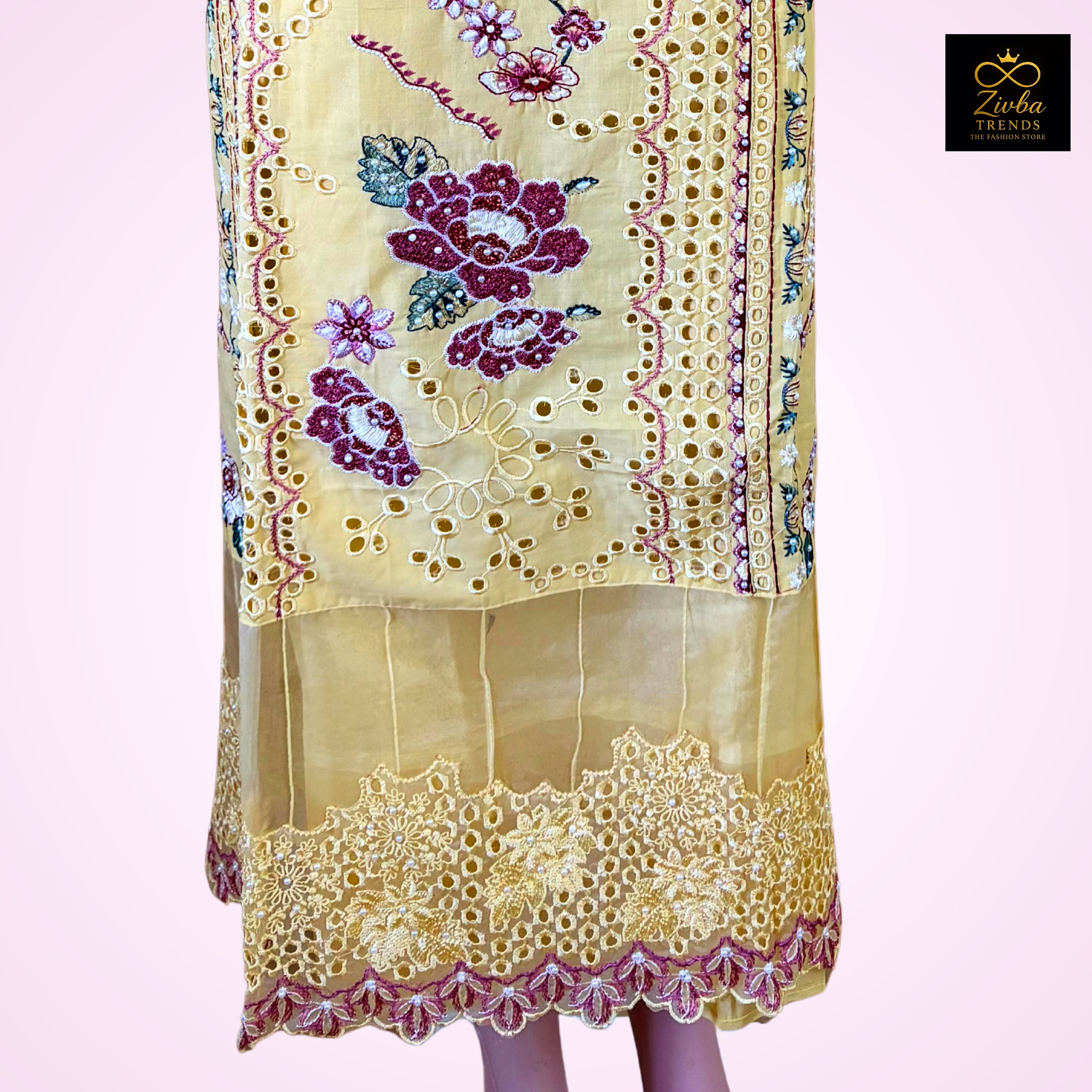 This Yellow unstitched suit from Zivba Trends is designed for buyers seeking reliable women's unstitched suit suitable for both Indian and international markets. The fabric and construction are selected to offer everyday comfort and dependable wear with a suit set format that works well for office, festive and occasion wear. Design elements such as embroidered detailing, cut-work design add visual interest while maintaining a balanced, wearable look for repeat use. Standardised sizing supports easy assortment planning for retailers, resellers and online marketplaces. This style is well suited for boutiques, e-commerce sellers and wholesale buyers looking for consistent women痴 ethnic wear options.